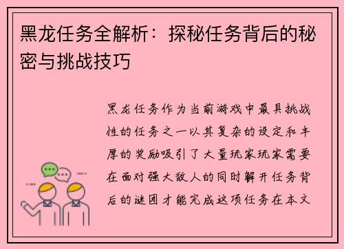 黑龙任务全解析:探秘任务背后的秘密与挑战技巧